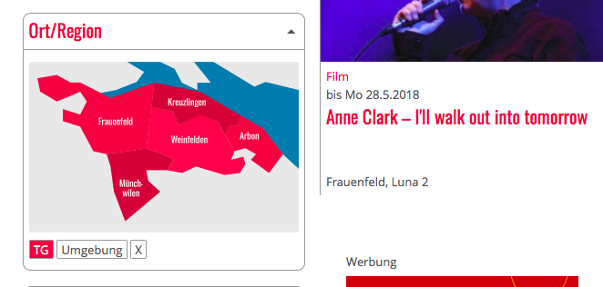 Suche via Karte: Sie wohnen in einer bestimmten Region und wollen wissen, was dort in den nächsten Tagen los ist? Oder Sie planen einen Ausflug nach, sagen wir Kreuzlingen, und wollen wissen, was Sie dort machen können? Dann hilft Ihnen unsere neue Suche via Karte. Einfach auf die Region klicken, die Sie interessiert und schon werden Ihnen alle Veranstaltungen aus unserer Datenbank für dieses Gebiet angezeigt. Über die Buttons „TG“ und „Umgebung“ können Sie auch Veranstaltungen aus dem kompletten Thurgau anzeigen lassen oder auch nur jene aus der Umgebung Winterthur, St. Gallen, Konstanz und Schaffhausen.