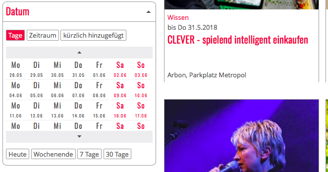 Suche via Datum: Wenn Sie wissen wollen, was an einem bestimmten Datum geboten ist, können Sie das auch über unsere Datumssuche herausfinden. Entweder Sie wählen einen konkreten Zeitraum aus oder Sie klicken auf die Buttons „Heute“, „Wochenende“ „7 Tage“ oder „30 Tage“. Entsprechend des gewählten Zeitraums werden Ihnen dann Veranstaltungen angezeigt. Neu ist auch, dass Sie nicht nur zusammenhängende Daten auswählen können, sondern auch alle Tage, die Sie interessieren einzeln anwählen und kombinieren können.