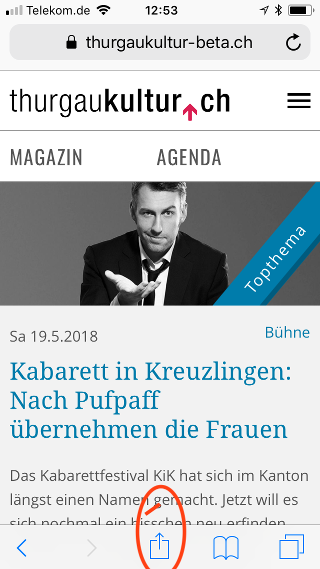 Das rot umkreiste Quadrat mit Pfeil (Bild links) auswählen und dann einfach "Zum Home-Bildschirm" (Bild rechts) hinzufügen. Auf Android- oder Google-Geräten funktioniert das ganz ähnlich. Anleitungen dazu finden Sie unter anderem hier bei der Zeitschrift pctipp.ch