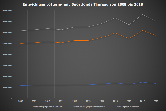 Alleine 2018 sind nach Angaben des Thurgauer Regierungsrats insgesamt mehr als 14 Millionen Franken in Sport- und Lotteriefonds geflossen. Der Löwenanteil (11,4 Millionen) wanderte in den Lotteriefonds. Nach einer einfachen Anfrage des CVP-Kantonsrats Hans Feuz hatte der Regierungsrat Zahlen hierzu offen gelegt. Daraus wird auch ersichtlich, dass der Sport- und Lotteriefonds in den vergangenen 10 Jahren stetig gewachsen ist: Von 12,2 Millionen (2008) auf heute über 14 Millionen Franken (siehe Grafik unten).5. Welche Konsequenzen hätte eine Ablehnung des Gesetzes für die Kultur?