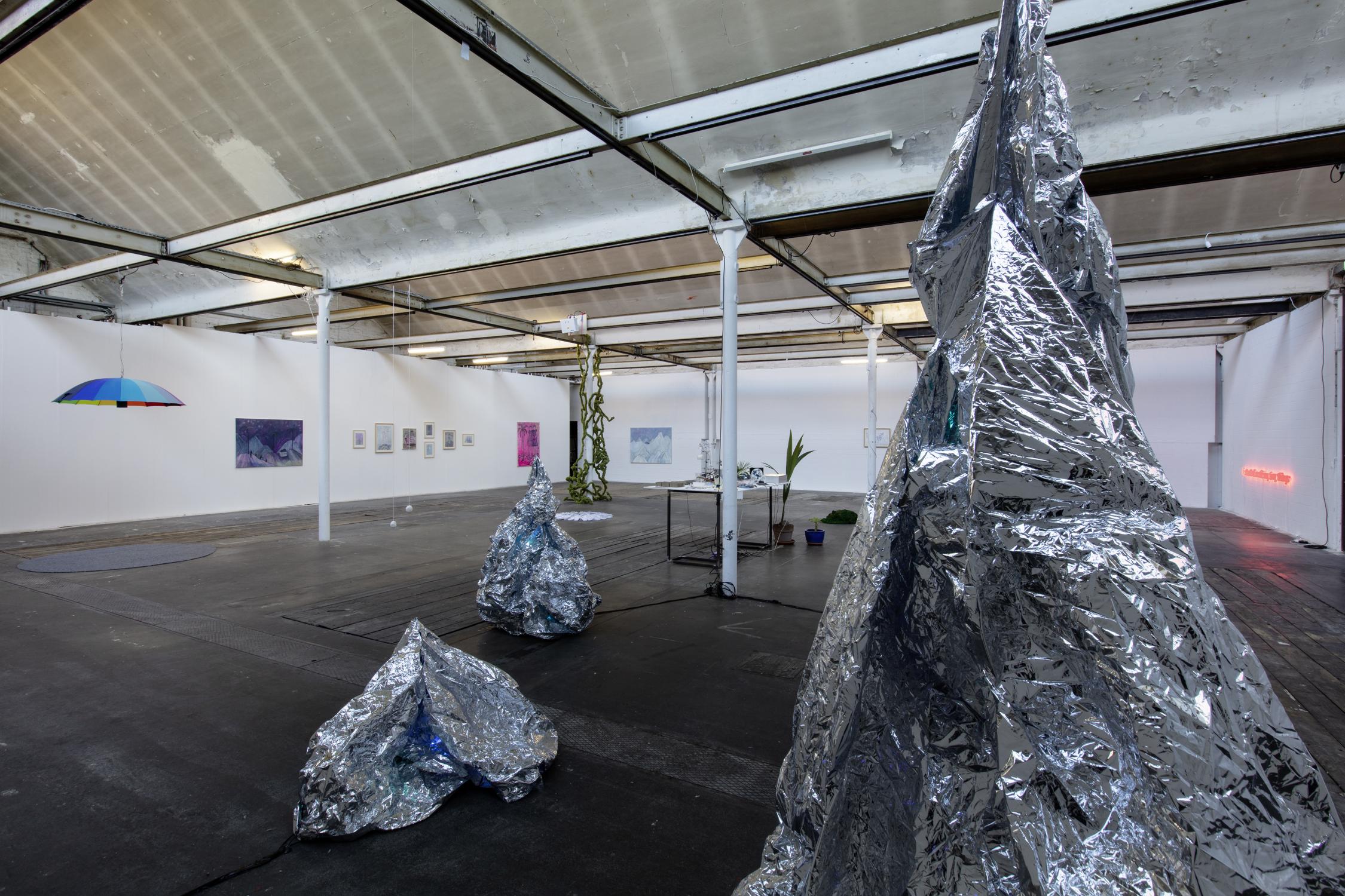Ganz im Einklang mit dem Titel zeigt sie auch eine Installation aus silbernen Rettungsdecken, die sie zu Eisbergen drapiert hat und beleuchtet.