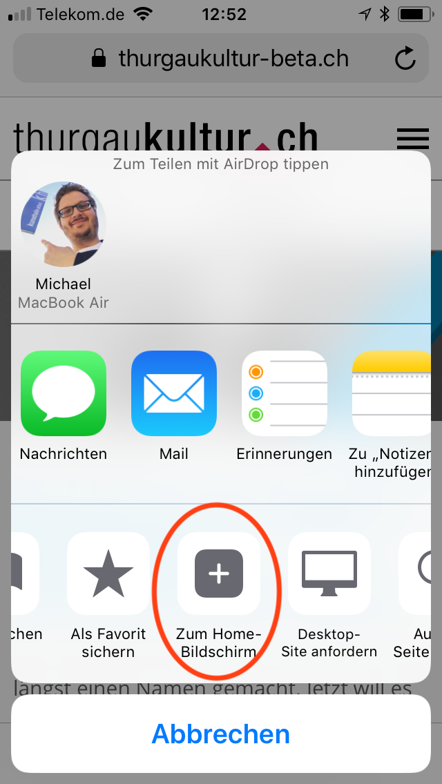 Das rot umkreiste Quadrat mit Pfeil (Bild links) auswählen und dann einfach "Zum Home-Bildschirm" (Bild rechts) hinzufügen. Auf Android- oder Google-Geräten funktioniert das ganz ähnlich. Anleitungen dazu finden Sie unter anderem hier bei der Zeitschrift pctipp.ch