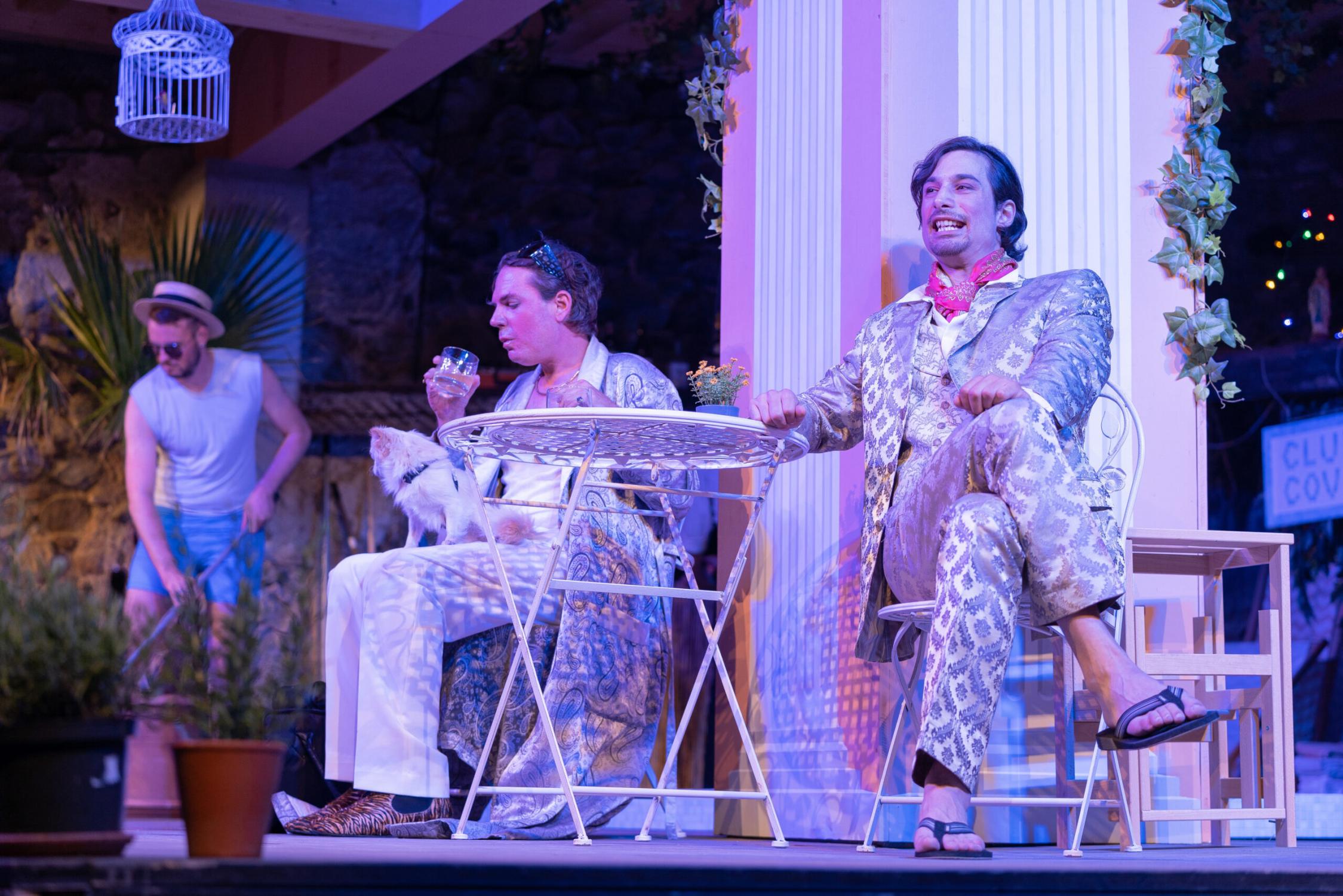 Während der Pooljunge (Luca Zimmermann, links) für Ordnung sorgt, sind der Conte (Mischa Löwenberg, Mitte) und der Marchese (Falk Döhler, rechts) mit ihren Hahnenkämpfen beschäftigt. | Bild: Oliver Gerber