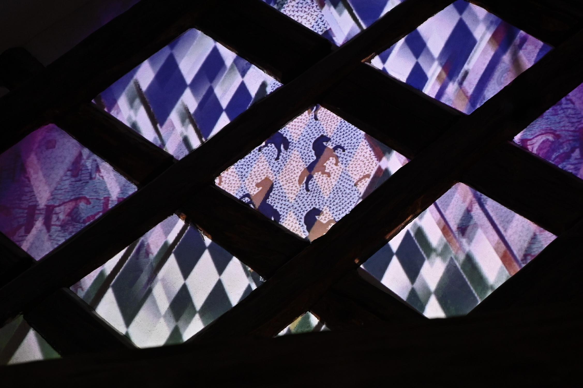 Olga Titus, aufgewachsen im Thurgau, heute in Winterthur zu Hause, ist für ihre farbfreudigen Videos bekannt, in denen sich Paradiesgärtchen um sich selbst drehen. Kaleidoskop-artig wandern die Bruchstücke von gemusterten Bildern über das Giebelgebälk des Dachstockes im Haus zur Glocke. Wobei das Wort „über“ zu relativieren ist: In die Videoprojektion ist ein passendes Raster eingefügt, das verhindert, dass die Holzbalken selbst auch von der Projektion beleuchtet werden.