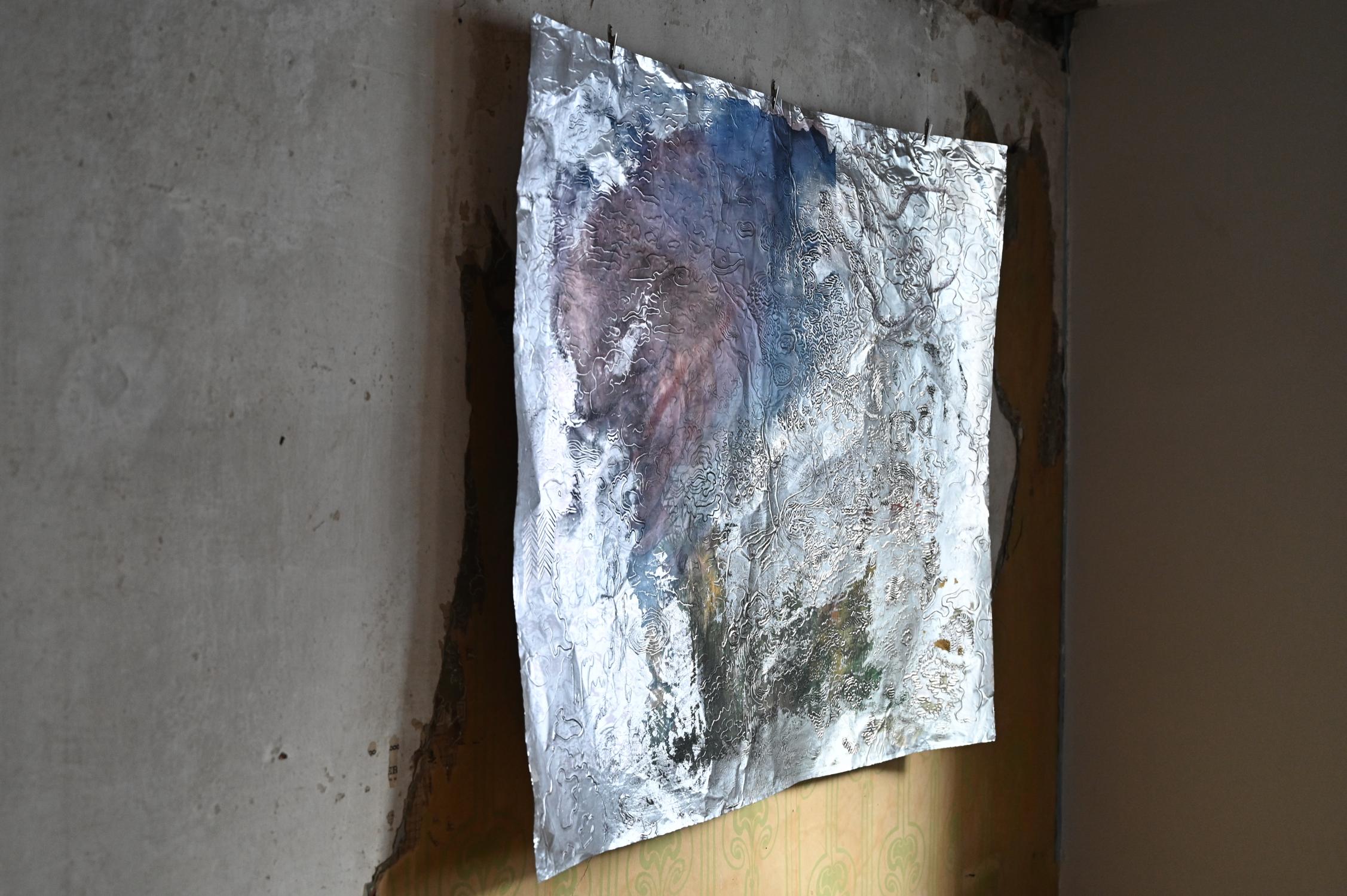Auf einer dünnen Aluplatte hat sie durch Strukturprägung Zeichnungen hinterlassen, denen ein wenig verwischte Farbe beigegeben wurde. Den Rahmen dazu bildet – wen wundert es – mal wieder eine Wand des Hauses zur Glocke. Alte Tapete, Farbe, Mauerwerk.