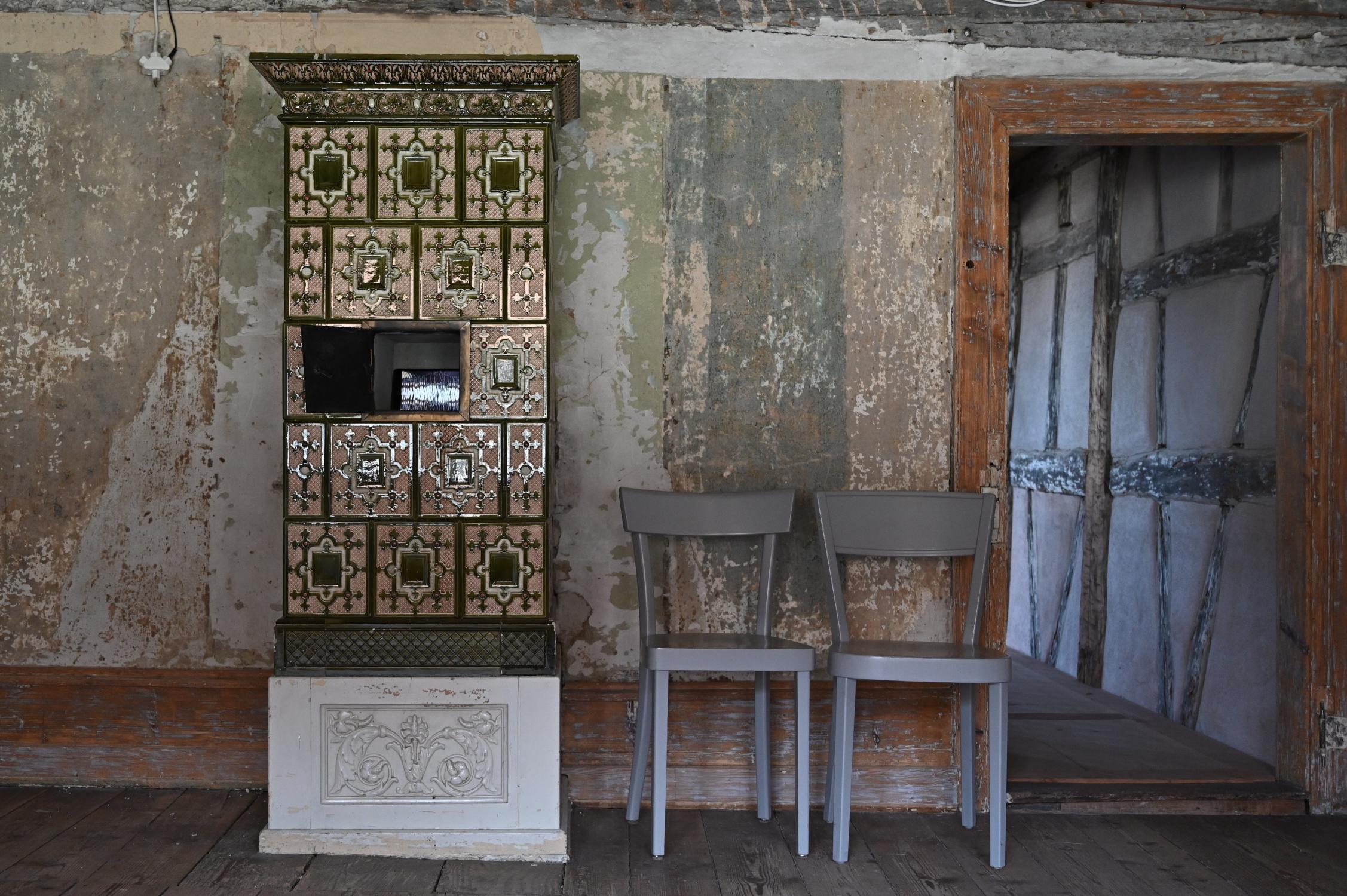 Auch in den Obergeschossen finden sich Videos, die aus der Beschäftigung mit abstrakten Formen hervorgegangen sind, die bewegt und vervielfacht werden. Drei Tablets hat sie in Winkeln des Hauses versteckt, eines davon in einem Kachelofen, der einen dreidimensionalen Rahmen bildet. Wobei in einer Raumecke dann ein Chor erklingt: Drei „Sängerinnen“ (Sarah Hugentobler) stimmen den Beatles-Song „Because“ an.