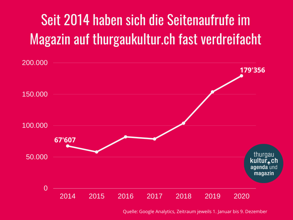 Reden wir nicht lange drumherum - 2020 war ein ziemlich elendes Jahr. Umso schöner für uns, dass wir es mit einer guten Nachricht verabschieden können: Das Corona-Jahr war für das Magazin von thurgaukultur.ch ein Rekordjahr! Unsere Artikel, Analysen, Porträts und Besprechungen wurden so oft gelesen wie noch nie zuvor in einem Jahr.