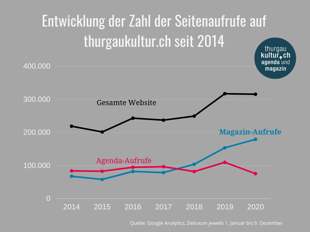 Betrachtet man die Seitenaufrufzahlen für das gesamte Portal, also auch für die Agenda und den Kulturplatz, dann war 2020 das zweitbeste Jahr der Geschichte von thurgaukultur.ch Auf allen Ebenen wurde unsere Seite in diesem Jahr mehr als 315’000 aufgerufen. Im Vergleichszeitraum waren es 2019 mit 317’000 noch etwas mehr. Es ist aber auch gut möglich, dass sich bis zum 31. Dezember auch hier das Verhältnis noch mal dreht.