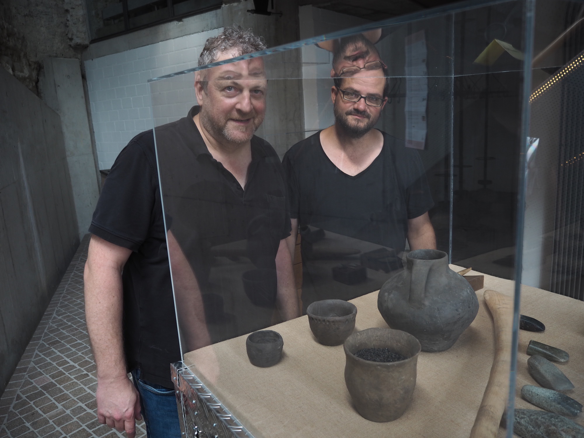 Bei der Arbeit: Alex Meszmer (links) kämpft nicht nur im Verband Visarte für Künstler, er ist auch selbst künstlerisch tätig. Das Bild zeigt ihn mit Reno Müller in ihrem Transitorische Museum in Pfyn. Bild: Michael Lünstroth